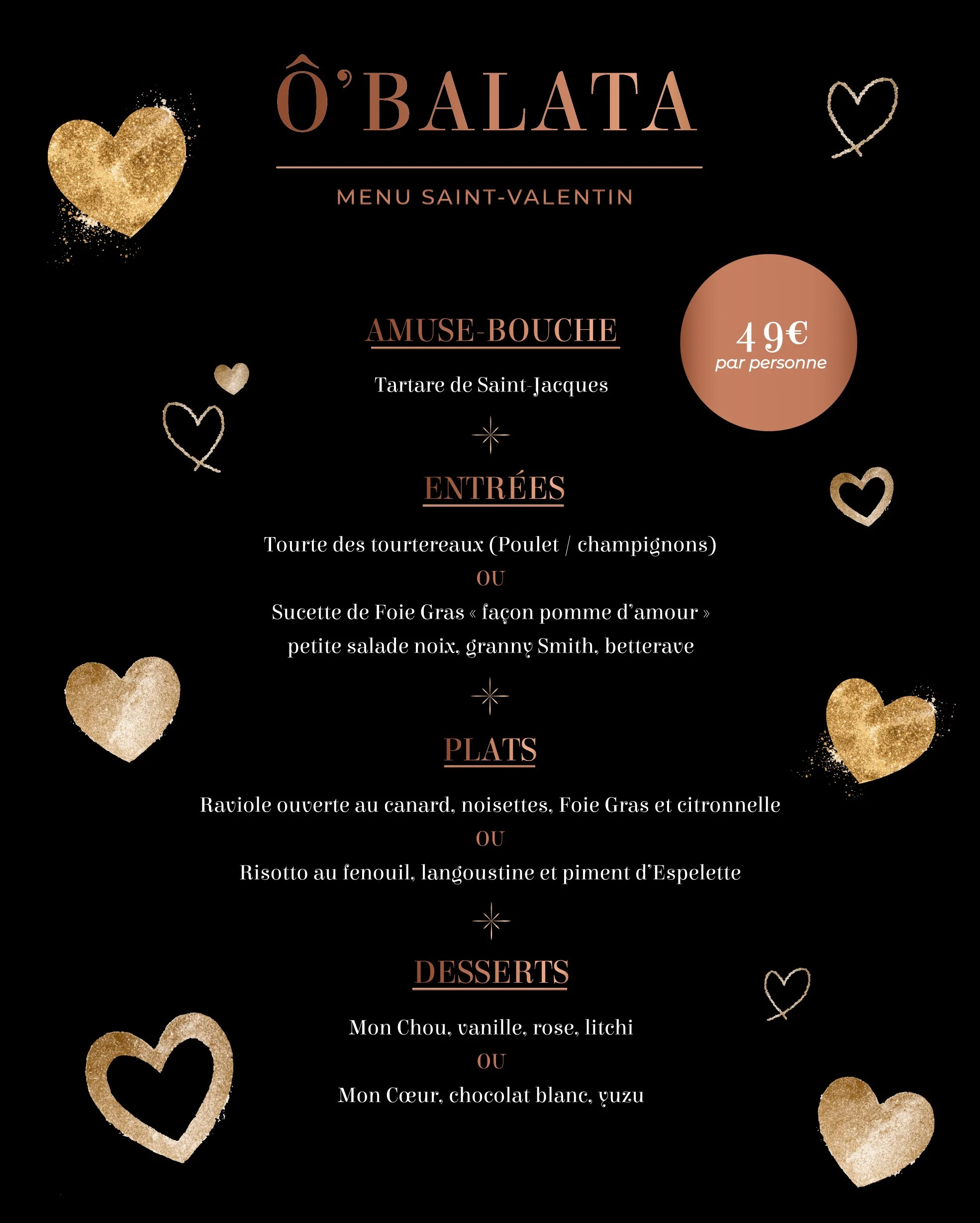 Le samedi 14 février, le restaurant Ô’Balata célèbre l’amour et vous invite à vivre un moment gourmand à deux. Dans une ambiance douce et romantique, laissez-vous séduire par notre menu spécial Saint-Valentin imaginé pour notre chef pour être savouré à deux.
